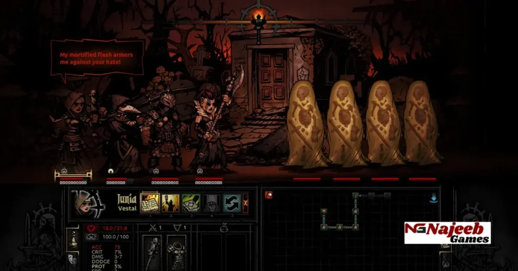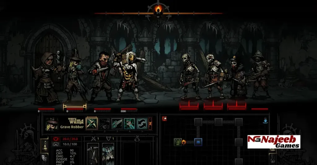 Darkest Dungeon features turn-based combat viewed from a side perspective. Players form a party of four heroes, each belonging to different classes such as Crusader, Vestal, Highwayman, Plague Doctor, and many others. Each hero has unique abilities, strengths, and weaknesses that determine their role in battle.