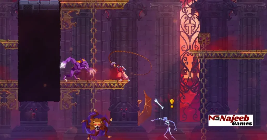 The gameplay retains the fast, responsive combat of Dead Cells, where quick reflexes, dodging, and smart weapon usage are essential for survival. New weapons inspired by Castlevania, such as the iconic Vampire Killer whip and magical sub-weapons, add variety to combat styles.