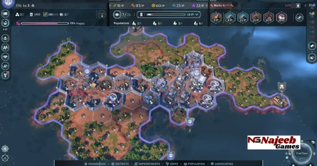 • City Management: Build and manage cities while balancing resource production, population growth, and technological advancements.