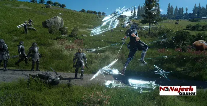 Combat in FINAL FANTASY XV is real-time, focusing on positioning, dodging, and weapon switching. Noctis can wield multiple weapon types including swords, greatswords, polearms, and firearms.