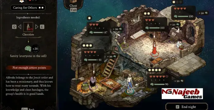 The Stone of Madness delivers a tense and methodical gameplay experience. Players control a small group of inmates, each with specific strengths such as stealth, distraction, combat, or lockpicking. However, every character also suffers from fears and psychological conditions that influence their behavior. Darkness, isolation, or certain enemies can trigger panic, forcing players to adapt their strategies.