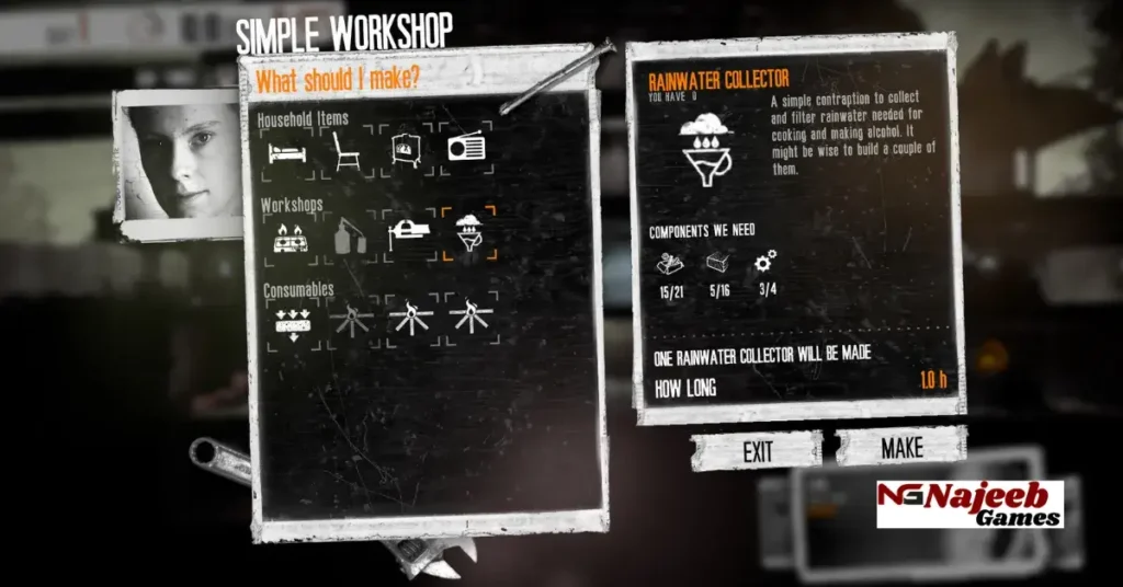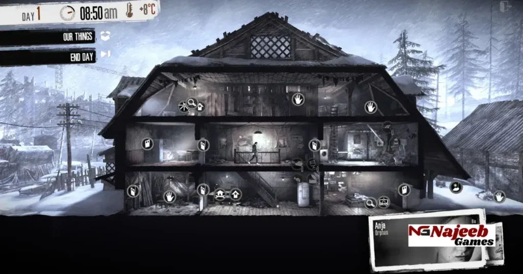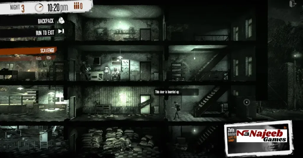 The gameplay of This War of Mine revolves around survival, resource management, and decision-making. Players control a group of civilians sheltering in a damaged house within a war-torn city. Each character has unique skills, strengths, and emotional traits that affect how they perform tasks and respond to stressful situations.