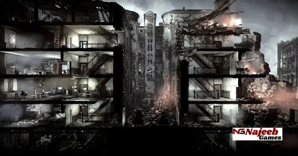 This War of Mine features a dark, hand-drawn visual style that reflects the grim atmosphere of a city destroyed by war. The environments are detailed yet minimalistic, showing broken buildings, damaged streets, and abandoned homes.