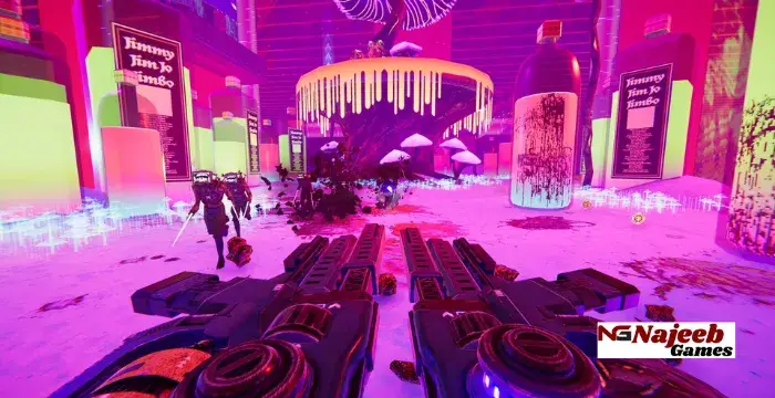 Turbo Overkill features a bold neon-soaked visual style that blends retro and futuristic aesthetics. Environments are vibrant and colorful, creating an adrenaline-fueling atmosphere that matches the gameplay intensity.
