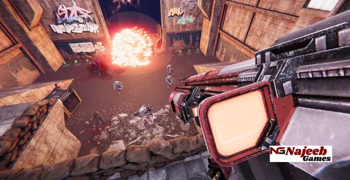 The weapon selection in Turbo Overkill is a highlight — ranging from rapid-fire rifles to absurd heavy hitters that feel weighty and impactful. Switching weapons mid-combat is essential to adapt to different enemy types and battle situations.